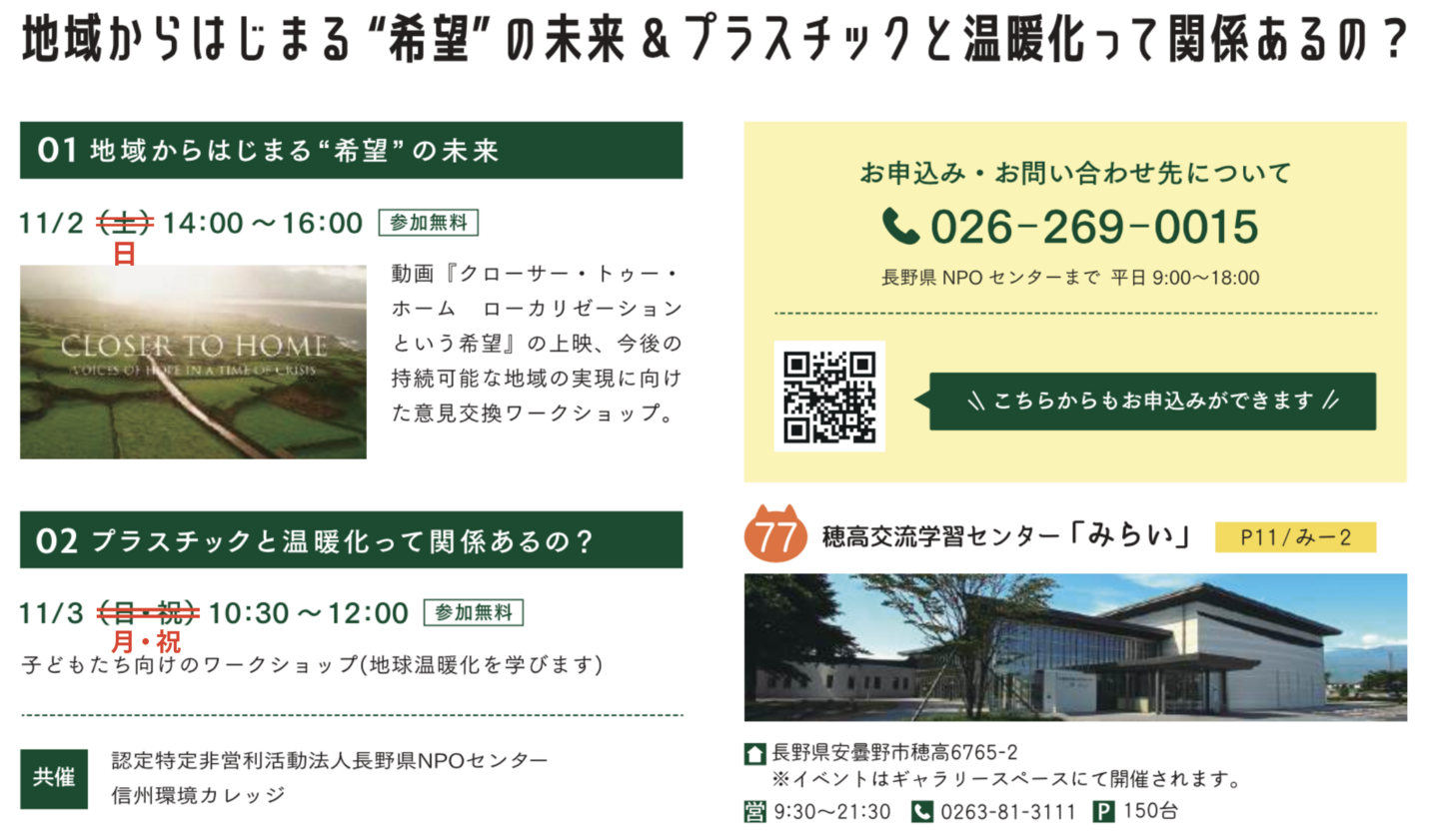 WELCOME ようこそ 2025年の「安曇野スタイル」は 11月1日(土)〜11月3日(月祝)に開催します! ※20周年記念プレオープンイベントとして、10月31日(金)にオープンしている会場もあります! お詫びと訂正 配布されているガイドブックについて、下記の箇所に誤りがありました。 謹んでお詫び申し上げます。 (WEB版は修正済です) P14 01 地域からはじまる”希望”の未来 誤 11/2(土) 正 11/2(日) 02 プラスチックと温暖化って関係あるの? 誤 11/3(日・祝) 正 11/3(月・祝) P12 誤 穂高有明拡大図p18 正 穂高有明拡大図p13 facebook ,facebook,,{"facebookPageUrl":"https://www.facebook.com/azuminostyle","boxHeight":"556","boxWidth":"100","dispFace":false,"dispUpdate":true,"dispHeader":false,"wUnit":"%","hUnit":"px"}